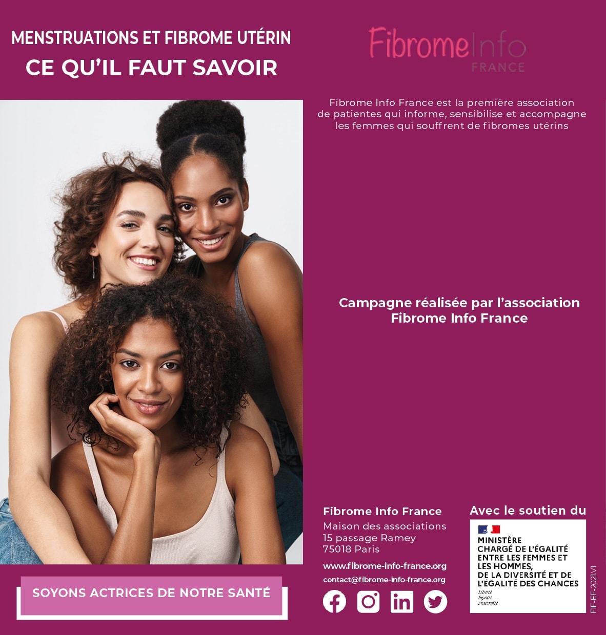 Fibrome Info France bénéficie une nouvelle fois du soutien du ministère chargé de l’égalité entre les femmes et les hommes, de la diversité et de l’égalité des chances, et réalise le 8 mars 2021 sa quatrième campagne de sensibilisation. L’association met au cœur de son combat les enjeux sanitaires et sociétaux du fibrome utérin.