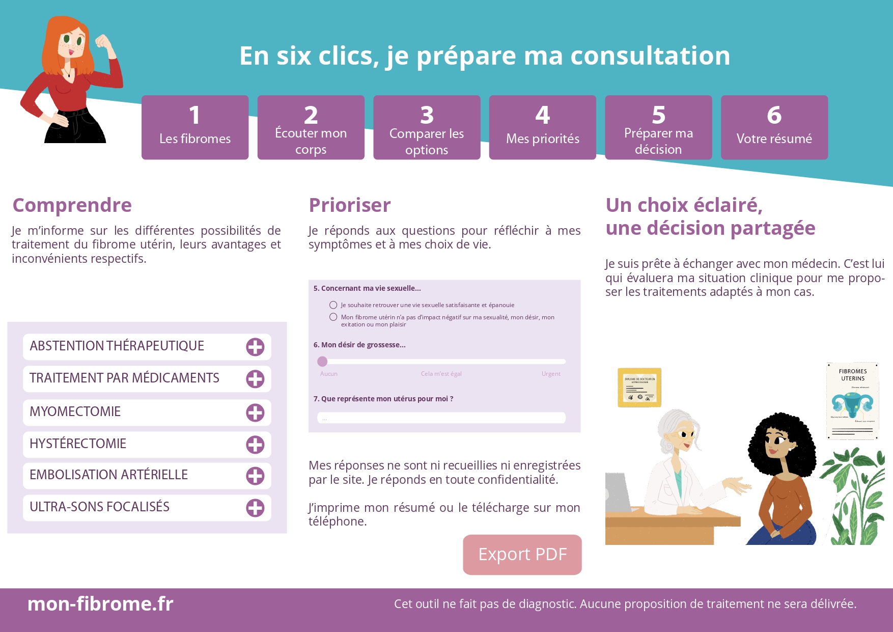 La plateforme d’aide à la prise de décision Mon Fibrome.fr résulte d’un travail collaboratif entre l’ARS d’Ile de France et Fibrome Info France mené conjointement de 2019 à 2020. Cette plateforme d’aide à la prise de décision médicale a vocation à informer les patientes sur l’ensemble des options thérapeutiques existantes afin de permettre aux femmes touchées par la maladie d’avoir une vision globale des traitements disponibles et faciliter le dialogue entre soignants/soignées pour une prise de décision médicale partagée.